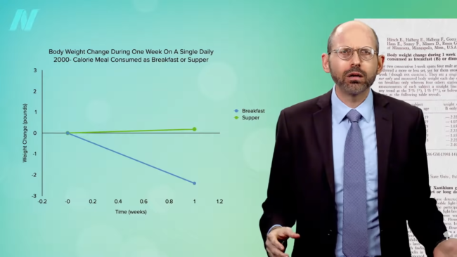 Harness the power of your circadian rhythms for weight loss by making breakfast or lunch your main meal of the day. In my last chronobiology video, we learned that calories eaten at breakfast are significantly less fattening than the same number of calories eaten at dinner, as you can see at 0:14 in my video…