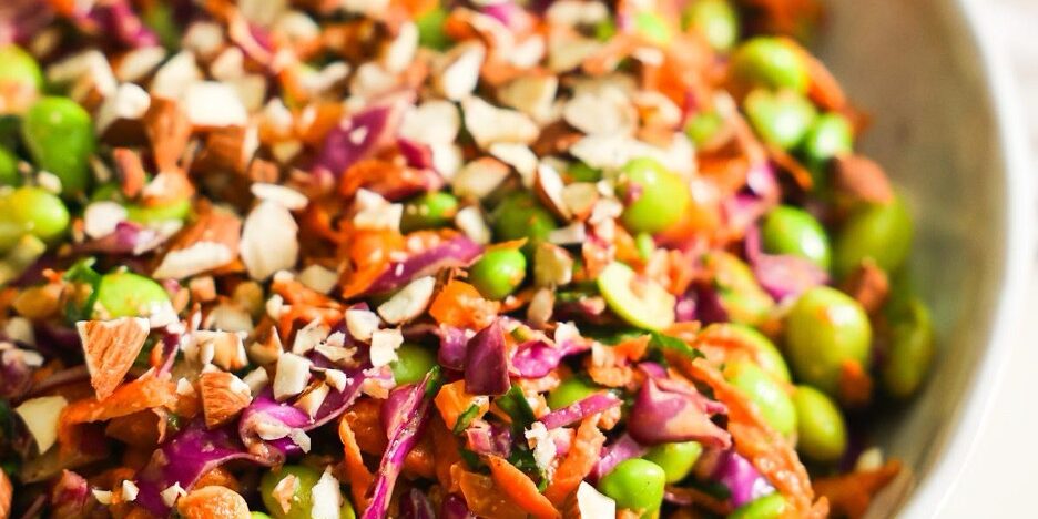 - In a large mixing bowl, add the edamame, red cabbage, carrots, bell pepper, scallions, and cilantro.