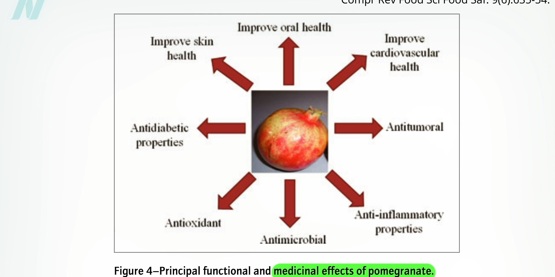 If you look at the medical literature on pomegranate in general, you’ll see reviews touting its many benefits, with diagrams like the one below on the medicinal effects of pomegranates (which you can also see at 1:01 in my video Pomegranate: A Natural Treatment for Rheumatoid Arthritis).