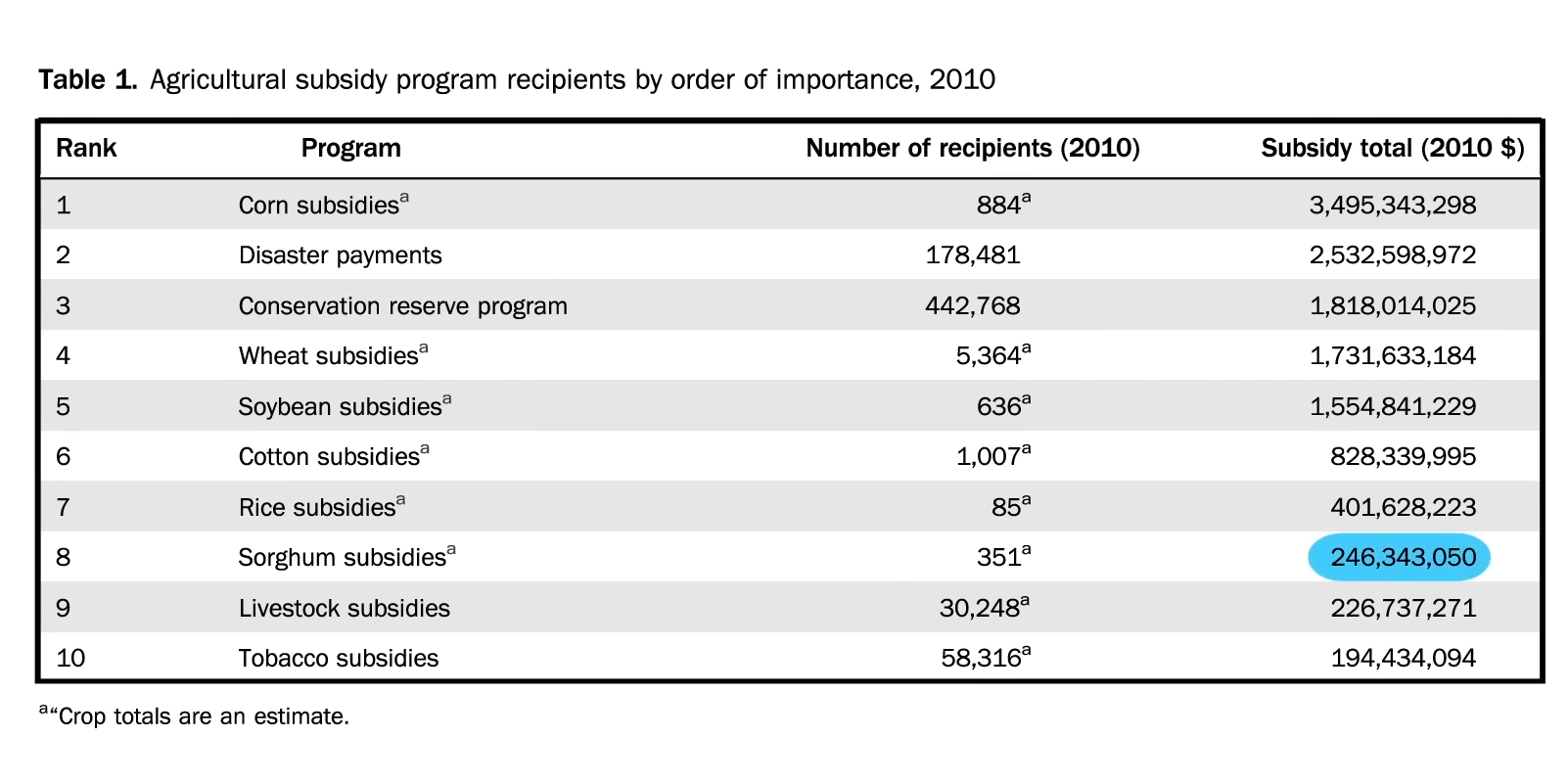 The rise in calorie surplus sufficient to explain the obesity epidemic was less a change in food quantity than in food quality. Access to cheap, high-calorie, low-quality convenience foods exploded, and the federal government very much played a role in making this happen. U.S. taxpayers give billions of dollars in subsidies to prop up the likes of the sugar industry, the corn industry and its high-fructose syrup, and the production of soybeans, about half of which is processed into vegetable oil and the other half is used as cheap feed to help make dollar-menu meat. You can see a table of subsidy recipients below and at 0:49 in my video The Role of Taxpayer Subsidies in the Obesity Epidemic. Why do taxpayers give nearly a quarter of a billion dollars a year to the sorghum industry? When was the last time you sat down to some sorghum? It’s almost all fed to cattle and other livestock. “We have created a food price structure that favors relatively animal source foods, sweets, and fats”—animal products, sugars, and oils.