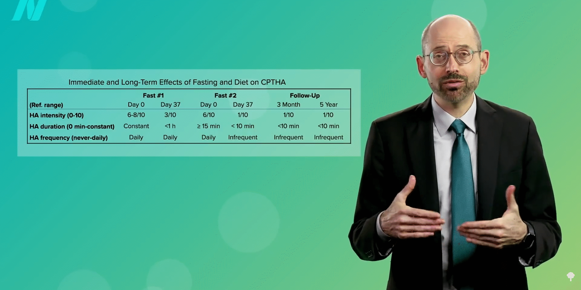 Before then, she had tried drug after drug after drug after drug after drug—with no relief, suffering in constant pain for years. Before the fast, she started out in constant pain. Then, after the fast, the intensity of the pain was cut in half, and though she was still having daily headaches, at least there were some pain-free periods. Six months later, she tried again, and eventually her headaches became mild, lasting less than ten minutes, and infrequent. She continued that way for months and even years, as you can see below and at 1:45 in my video Fasting for Post-Traumatic Brain Injury Headache.