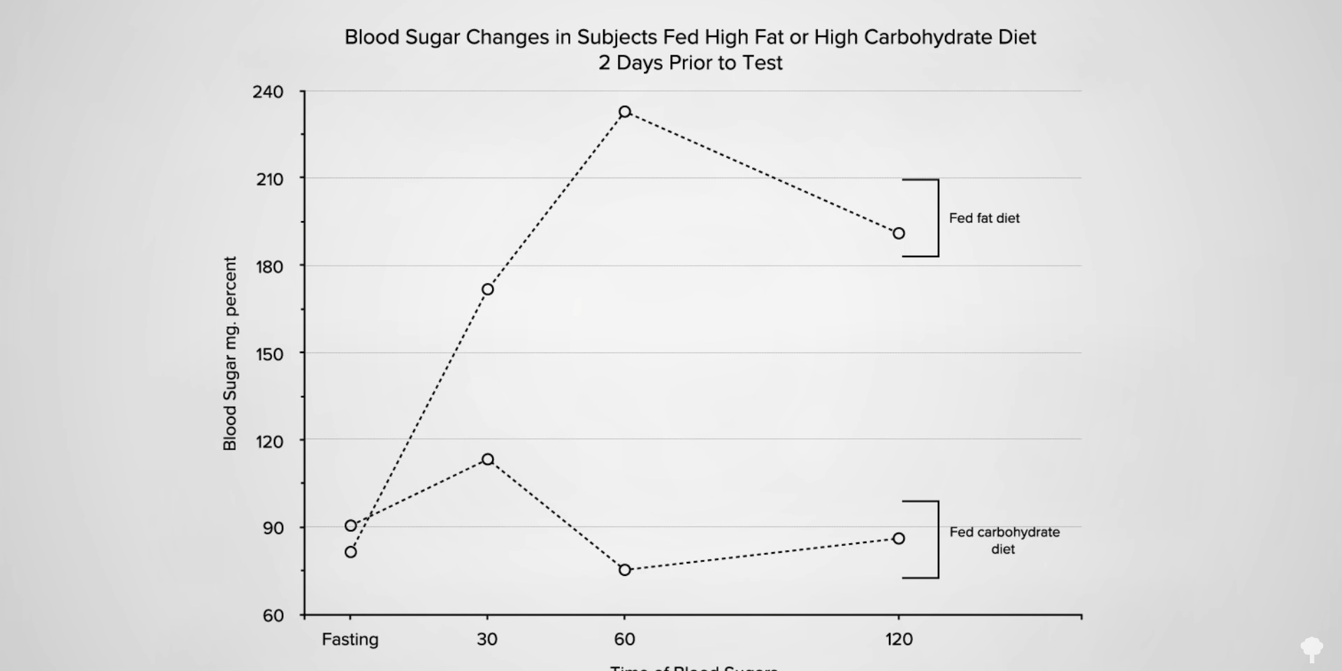 We’ve known for nearly a century that if you put people on a ketogenic diet, their carbohydrate intolerance can skyrocket within just two days. Below and at 0:46 in my video, you can see a graph from the study showing the blood sugar response two days after eating sugar. On a high-carb diet, blood sugar response is about 90 mg/dL. But, the blood sugar response to the same amount of sugar after a high-fat diet is about 190 mg/dL, nearly double. The intolerance to carbohydrates skyrocketed on a high-fat diet.