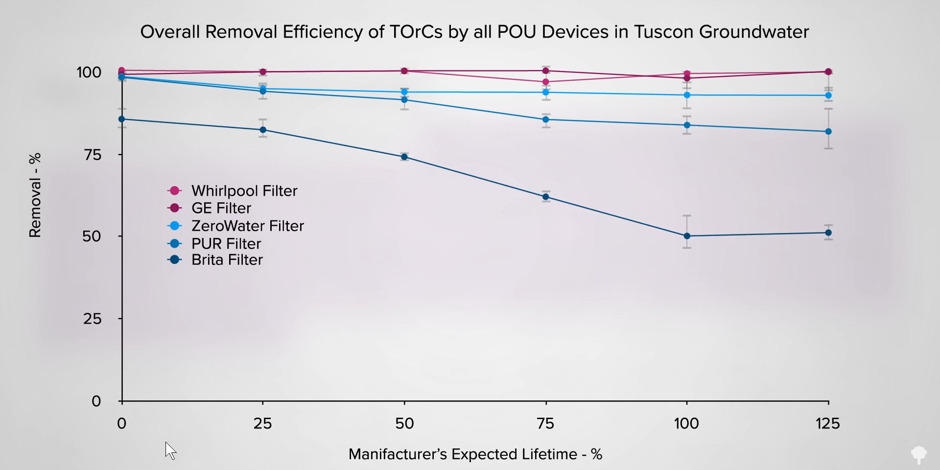 Nearly 40 percent of Americans use some sort of water purification device. I look at the comparisons of these devices in my video Is It Best to Drink Tap, Filtered, or Bottled Water?. Tap water from Tucson, Arizona, was pitted head-to-head against two of the most common purification approaches—pour-through pitchers and refrigerator filters. As you can see in the graph below and at 2:53 in my video, both fridge filters (GE and Whirlpool) did similarly well, removing more than 96 percent of trace organic contaminants, and edging out the three pitcher filters. ZeroWater caught 93 percent, and PUR pitchers got 84 percent. By the time the filters needed to be replaced, Brita was only catching 50 percent. A similar discrepancy was found between filters from PUR and Brita tested specifically against disinfection byproducts. They both started out about the same at the beginning, but by the end of the filter’s life, PUR appeared to do better, as you can see below and at 3:15 in my video. Reverse osmosis systems can work even better, but the cost, water waste, and loss of trace minerals don’t seem worth it.