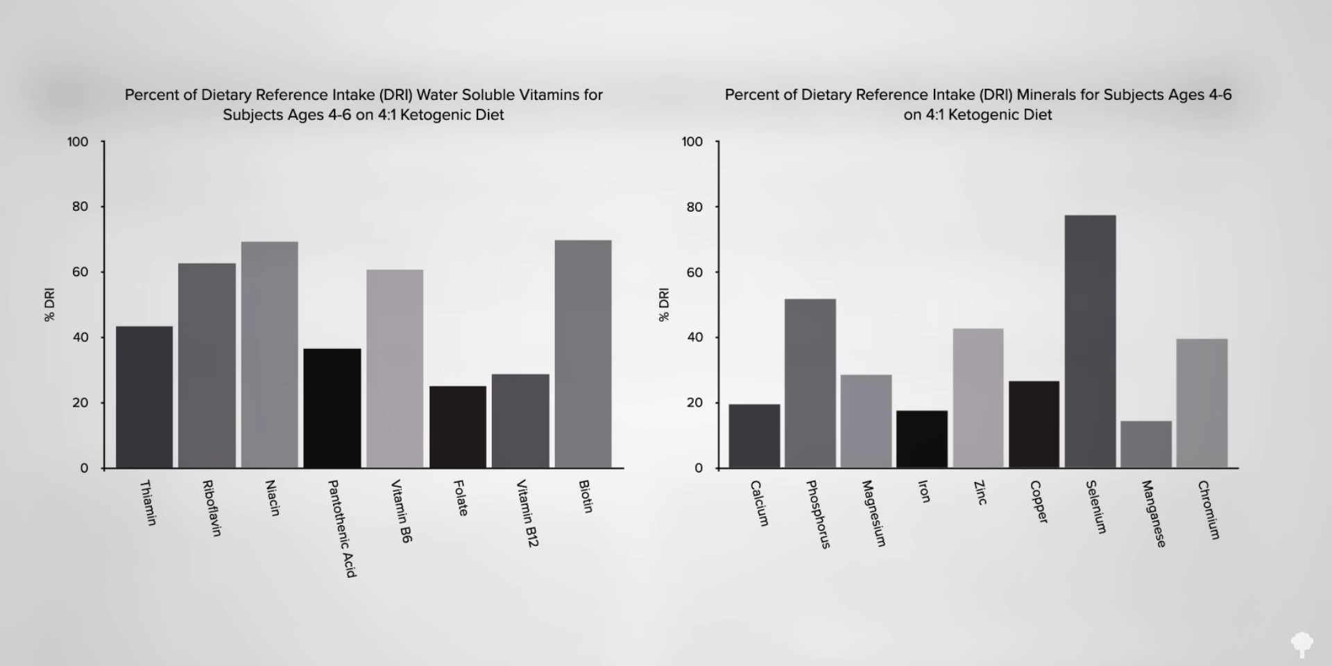 Given the decades of experience using ketogenic diets to treat certain cases of pediatric epilepsy, a body of safety data has accumulated. Nutrient deficiencies would seem to be the obvious issue. Inadequate intake of 17 micronutrients, vitamins, and minerals has been documented in those on strict ketogenic diets, as you can see in the graph below and at 0:14 in my video Are Keto Diets Safe?